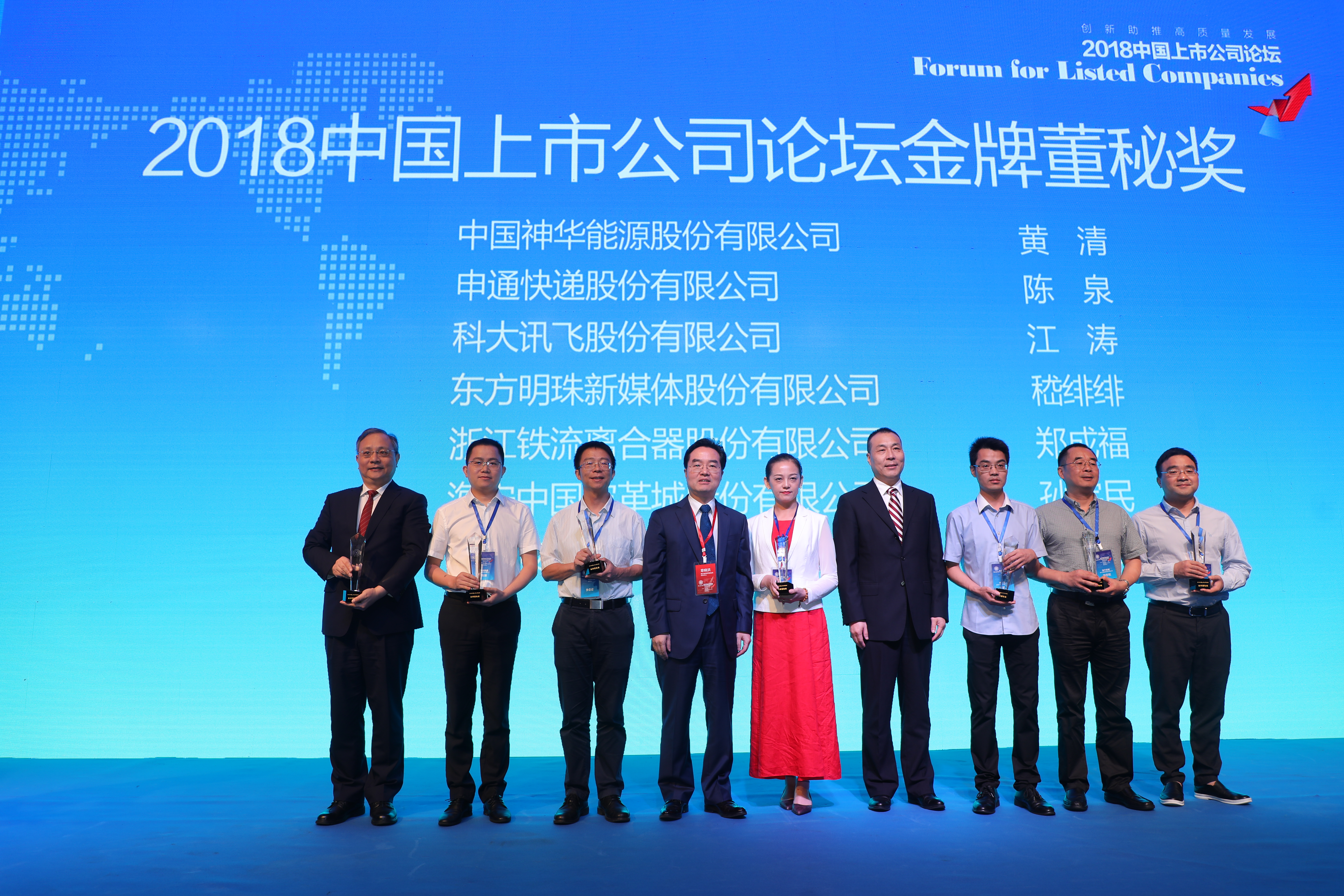 科大訊飛董事會秘書江濤(左三)榮獲“2018中國上市公司論壇”金牌董秘