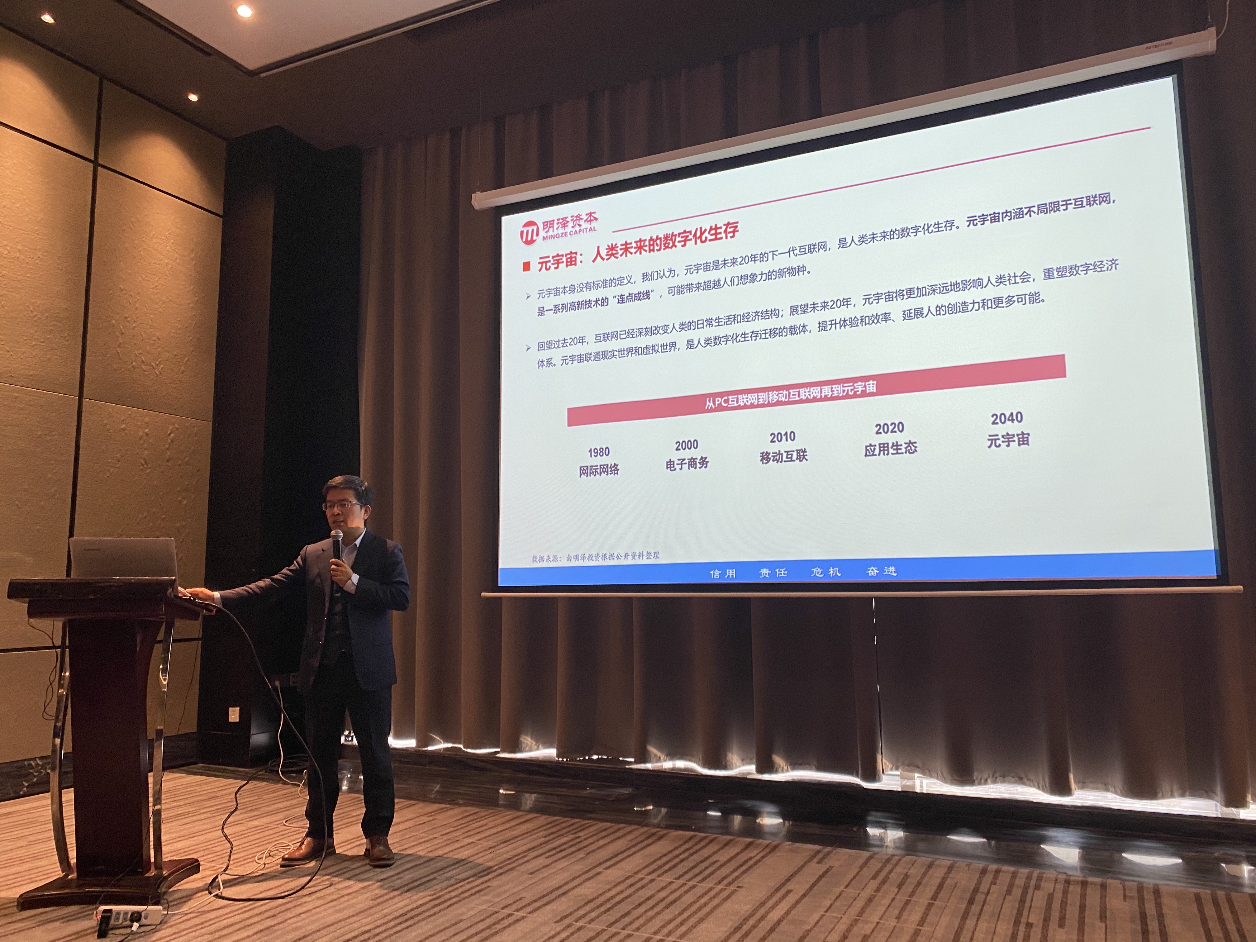 會(huì)議特邀明澤資本創(chuàng)始人馬科偉先生圍繞“元宇宙浪潮席卷,上市公司如何遨游新藍(lán)海”為主題,重點(diǎn)講解元宇宙的概念特點(diǎn)、從底層技術(shù)到前端設(shè)備再到場(chǎng)景的應(yīng)用,各路資源和技術(shù)如何在協(xié)同作用中如何發(fā)揮最大價(jià)值,并結(jié)合十四五規(guī)劃及2035年遠(yuǎn)景目標(biāo)給正在不同賽道布局元宇宙的公司給予投資建議和方向。
