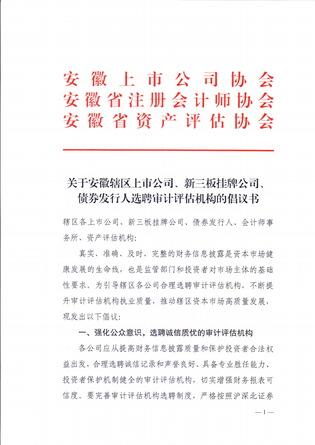 關(guān)于安徽轄區(qū)上市公司、新三板掛牌公司、債券發(fā)行人選聘審計(jì)機(jī)構(gòu)的倡議書
